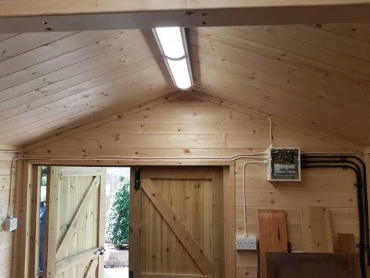 Lighting, power and heating for a solid pine storage shed housing several motorcycles.