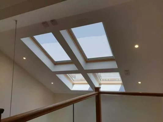 Electrically operated Velux widows with remote control. Collingwood LED downlighters either side.